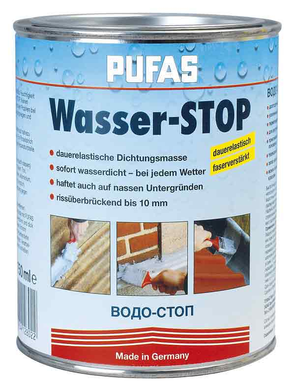Verarbeitung: PUFAS Wasser-STOP ist gebrauchsfertig und darf nicht verdünnt werden. Die Verarbeitung kann mit einem Pinsel oder einem Spachtel erfolgen. Bei der Verarbeitung muß darauf geachtet werden, daß die Oberfläche geschlossen ist und eine min. Schichtstärke von 2 mm erreicht wird. Erfolgt die Verarbeitung auf feuchtem Untergrund oder bei schlechten Witterungsverhältnissen (tiefe Temperaturen, Regen usw.), muß nach spätestens einer Woche ein zweiter Auftrag erfolgen. Ein Überstreichen mit Acrylfarben ist nach 12 - 24 Stunden (je nach Witterung) möglich. Nicht unter - 5° C oder über + 35° C Untergrundtemperatur verarbeiten. Die Arbeitsgeräte nach Gebrauch mit PUFAS Pinselreiniger reinigen.