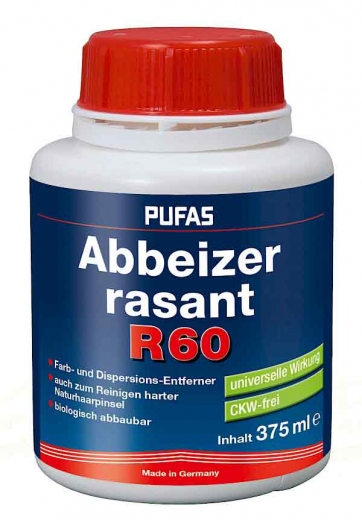 PUFAS Abbeizer rasant R60Anwendungsbereich:Entfernt Acryl- und Kunstharzlacke, Dispersions- und Latexfarben, Lasuren, Ölfarbenanstriche und ähnliche Beschichtungen von lösungsmittelbeständigen Flächen.